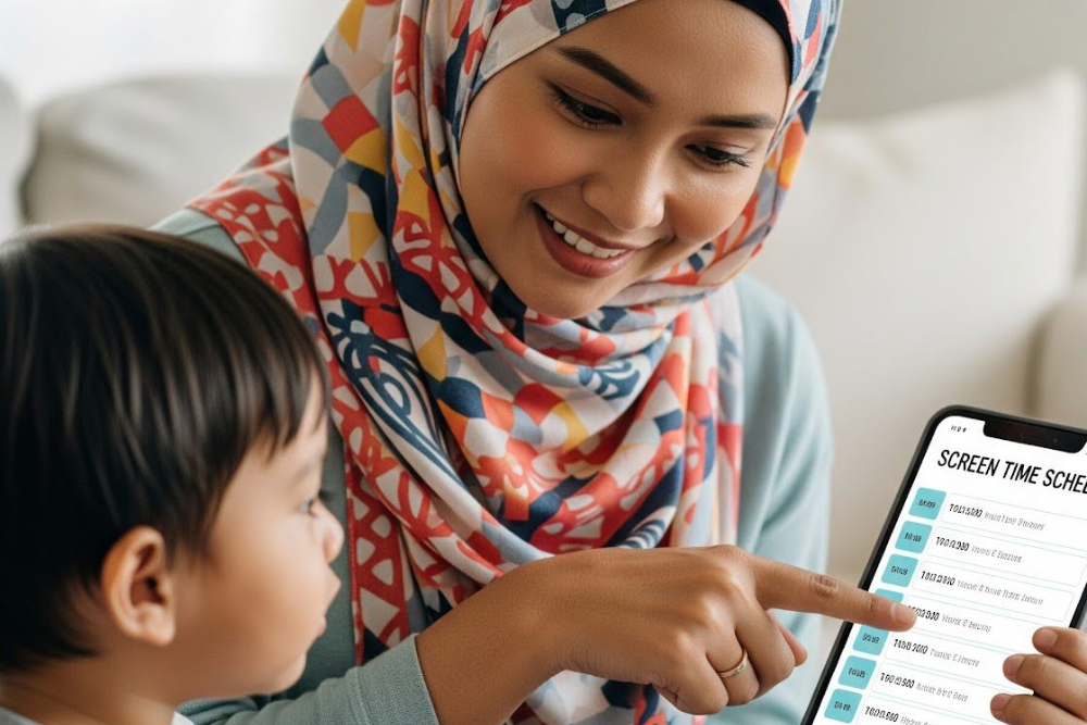 Sebelum beri gajet, bincang dulu peraturan screen time dengan anak. Bila anak terlibat, mereka lebih faham dan senang ikut. Terangkan kenapa masa itu penting , dan dalam Islam pun ajar kita untuk hargai masa dengan baik.