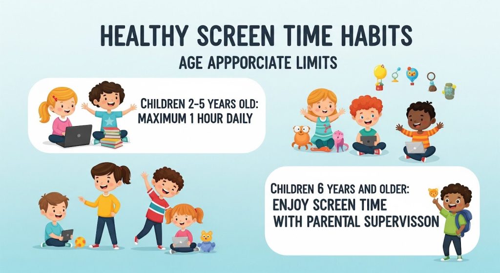 Tiada had masa yang spesifik, tetapi ibu ayah perlu memastikan keseimbangan antara masa skrin dengan aktiviti lain seperti tidur yang cukup, aktiviti fizikal, masa bersama keluarga dan interaksi sosial. Penetapan jadual, waktu tanpa gajet, dan rehat skrin secara berkala sangat digalakkan.